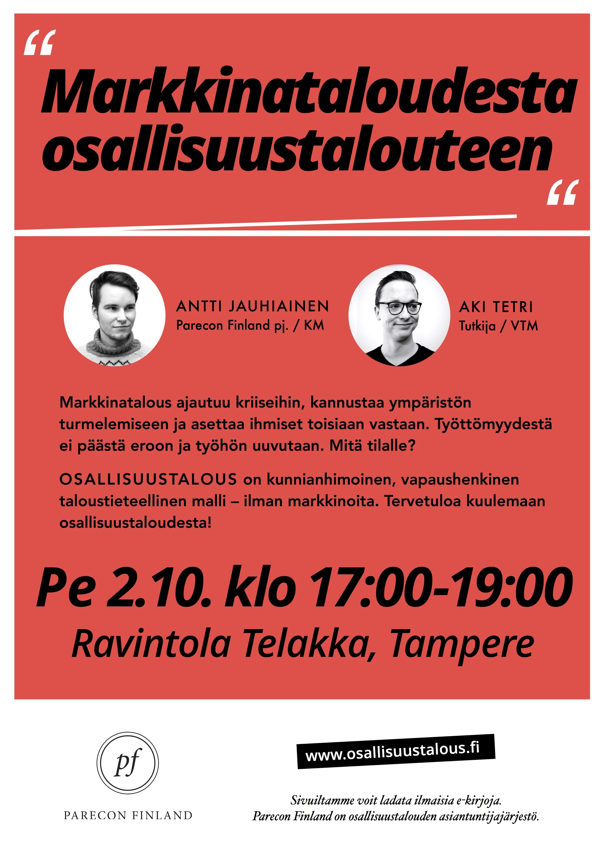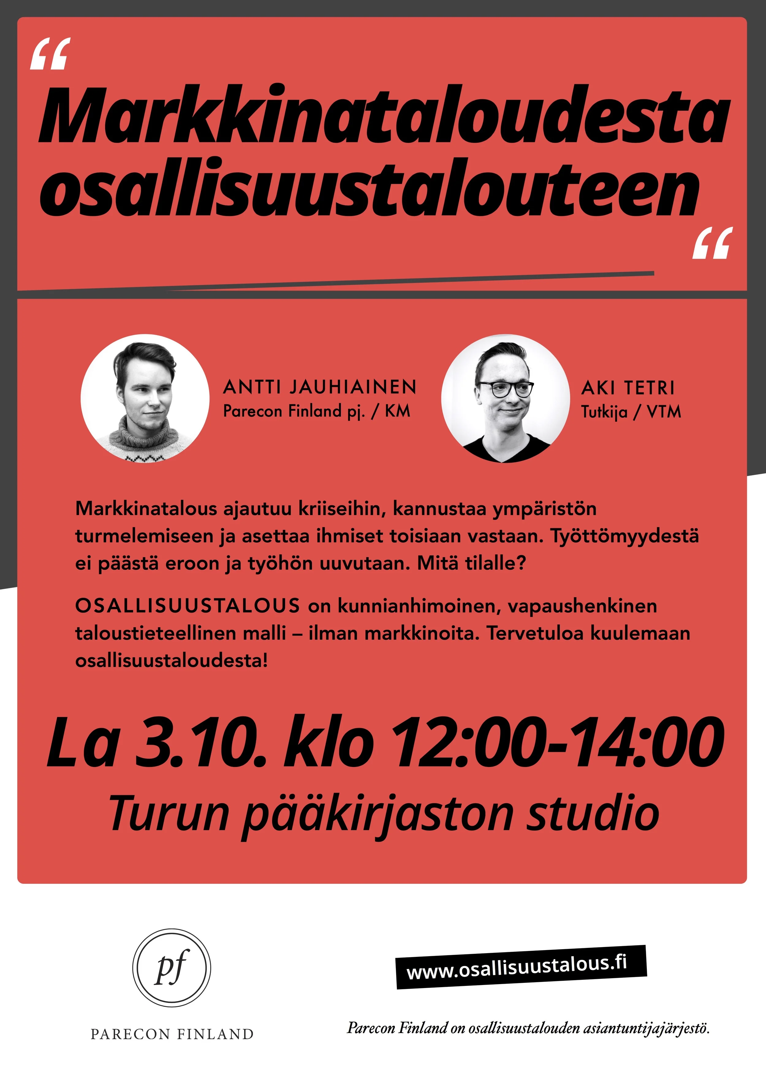 Parecon Finland järjestää lokakuun alussa Turussa ja Tampereella tilaisuudet, joissa on mahdollisuus tutustua osallisuustalouden perusteisiin. Tilaisuudet ovat myös erinomainen mahdollisuus tulla esittämään kysymyksiä ja keskustelemaan.